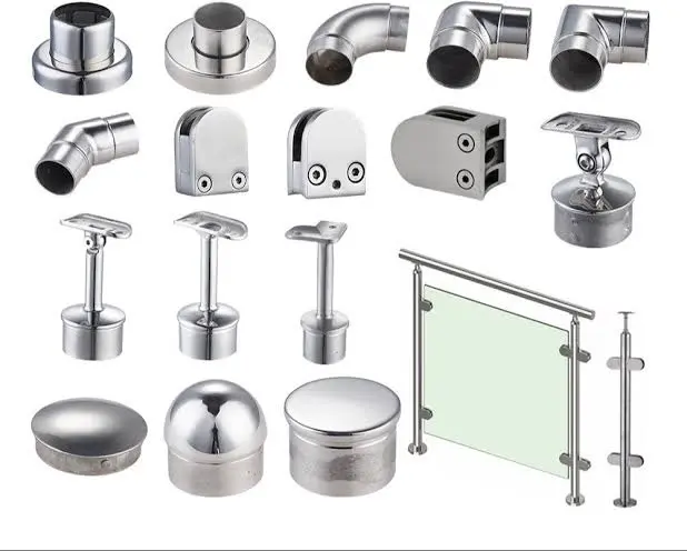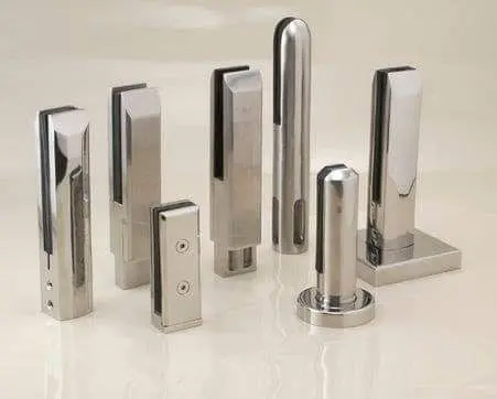 Extensive range of stainless steel and mild steel hardware accessories including handles, hinges, brackets, and fasteners. Available in polished, brushed, and PVD finishes.